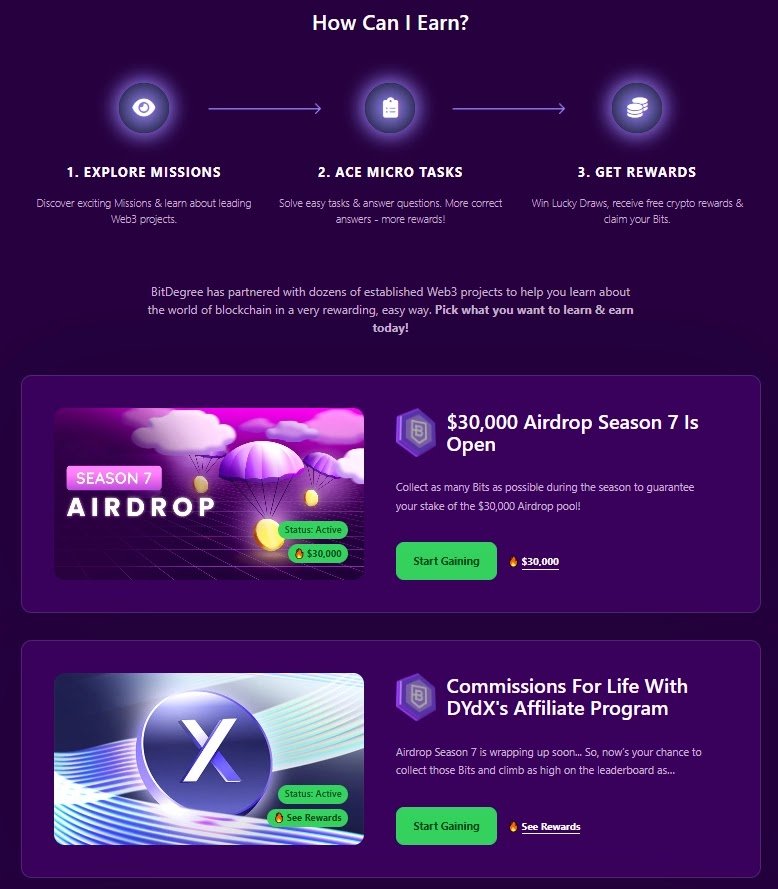 Bitdegree هي منصة تعليمية مصممة لمساعدة المستخدمين على التعرف على نظام Web3. إضافة إلى العملات الرقمية، تقدم Bitdegree خصومات على بعض المنتجات المتعلقة بالعملات الرقمية. بعض الدورات تقدم مكافآت قد تصل إلى 270 دولارًا. من الدورات التي قدمتها Bitdegree سابقًا: