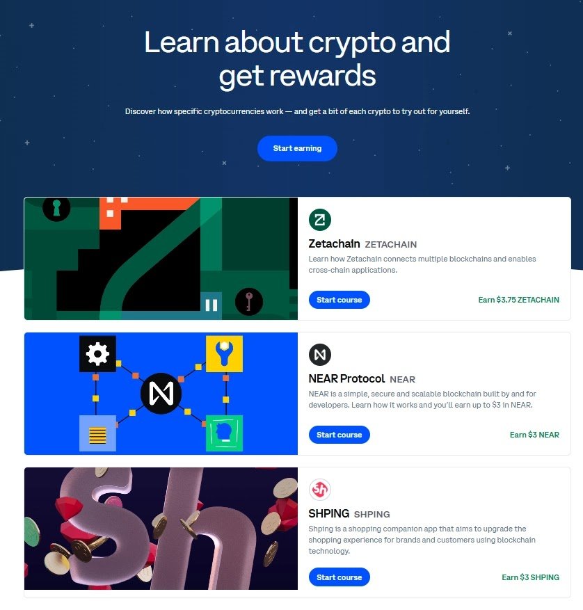 تُعد Coinbase واحدة من أكبر منصات العملات الرقمية في العالم. بعد إنشاء حساب، يمكن للمستخدمين ربح كمية صغيرة من العملات الرقمية (قد تصل إلى 24 دولارًا) مقابل إكمال وحدات تعليمية عن عملات رقمية مختلفة. كل وحدة عادة ما تستغرق بضع دقائق فقط لإتمامها.