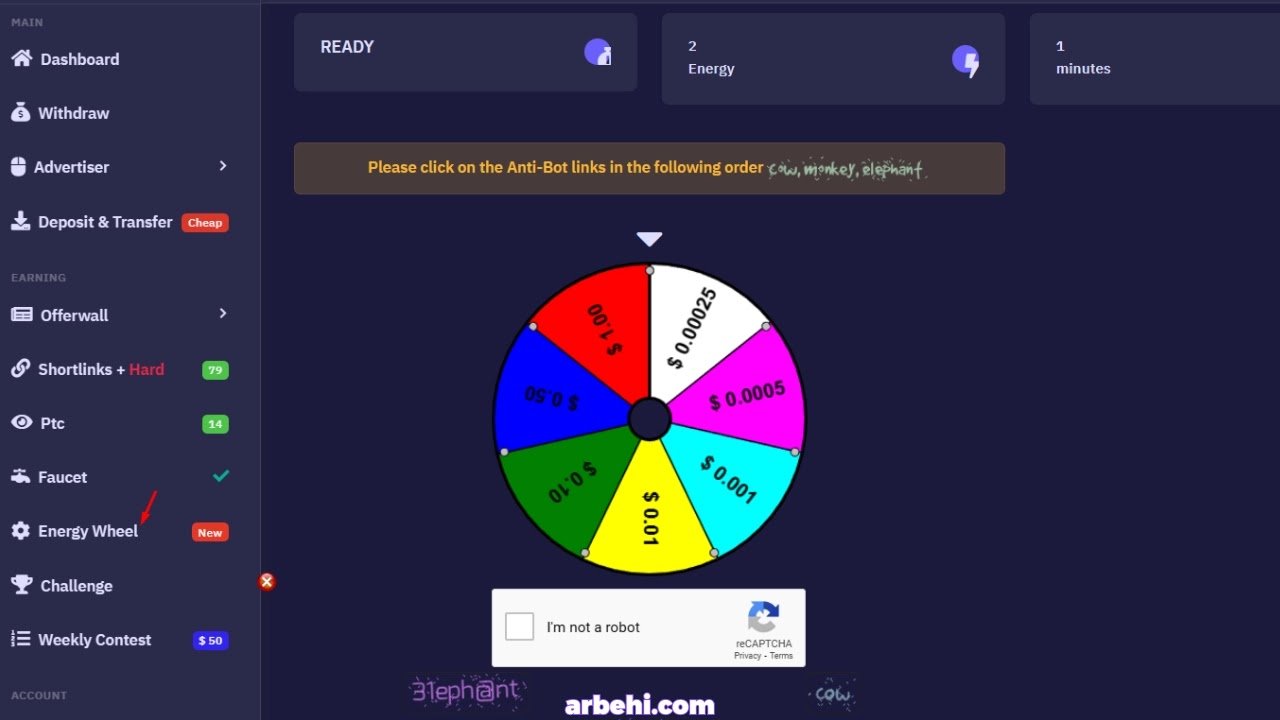 في آخر تحديث لموقع keforcash، تمت إضافة طرق جديدة لربح العملات الرقمية أهمها لعبة تدوير عجلة الحظ، والتي يمكنك الوصول إليها من خلال الضغط على “Energy Wheel” الموجودة في القائمة الجانبية، بعد ذلك عليك حل الكابتشا ثم تدوير العجلة وستحصل على مبلغ بعملة الدولار يمكن أنّ يصل إلى 1$، ولتدوير عجلة الحظ يجب أن يكون لديك Energy كافية، ويمكنك تدوير العجلة كل دقيقة وبمعدل 100 مرة يوميًا.