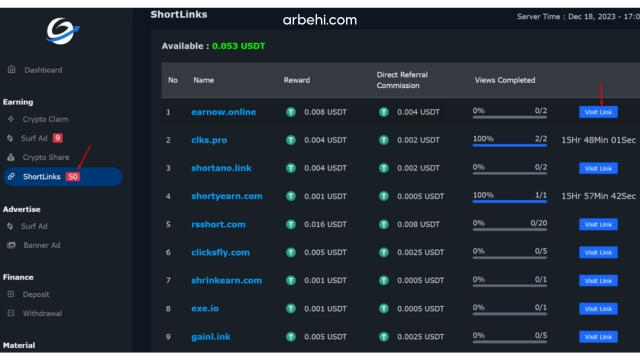 يوفر موقع Cointoffee أكثر من 50 رابط مختصر يوميًا، يمكنك من خلالهم الحصول على عملة USDT مجانًا، وللوصول إلى الروابط المختصرة ما عليك سوي الضغط على Shortlinks الموجودة في القائمة الجانبية، وبجانب كل رابط ستجد المبلغ الذي ستحصل عليه، آنقر على “Visit Link” ثم قم بتخطي الرابط وسيتم إضافة المبلغ مباشرة إلى رصيد حسابك.