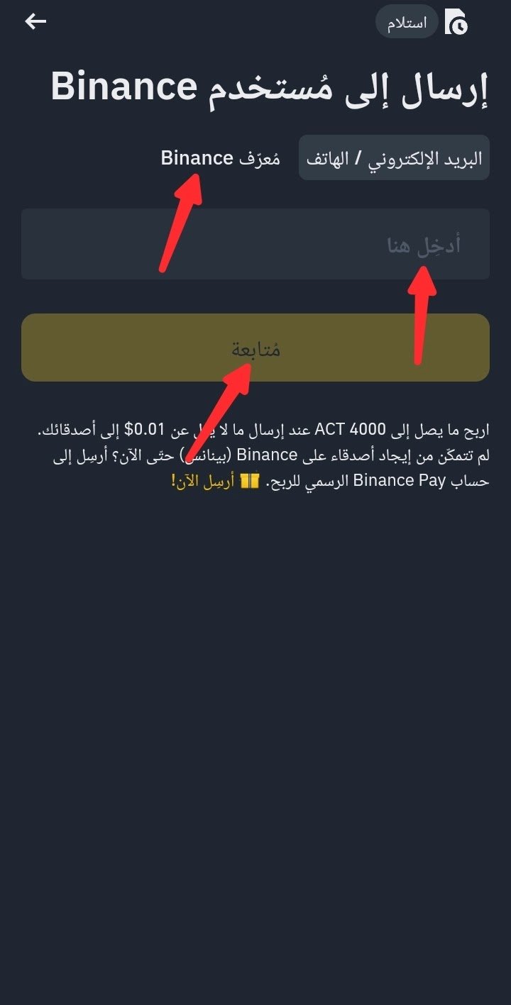 بدلاً من ذلك، يمكنك استخدام زر [إرسال] الموجود في قسم بينانس باي وإدخال البريد الإلكتروني للمستلم أو رقم الهاتف أو معرف بينانس (UID).