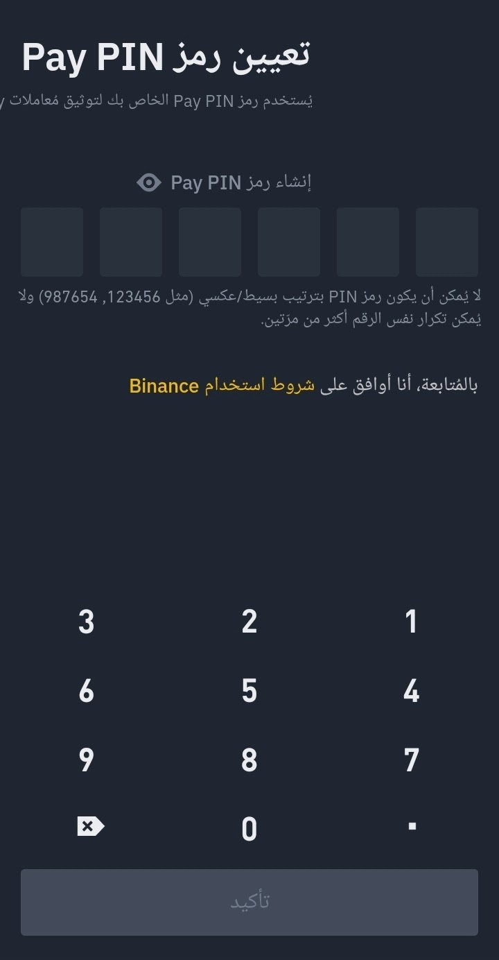 إذا كانت هذه هي المرة الأولى التي تستخدم فيها بينانس باي، قم بإعداد حسابك عن طريق إنشاء اسم مستخدم (Nickname) وكود PIN آمن.