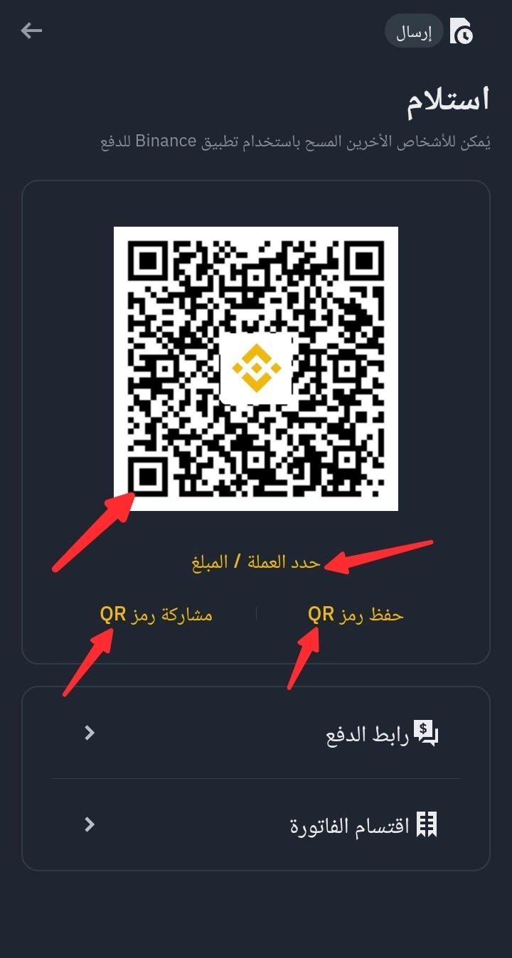 1. عبر رمز QR: اضغط على [استلام] في واجهة بينانس باي لتوليد رمز QR فريد. شارك هذا الرمز مع الدافع، حيث يمكنه مسحه ضوئيًا لإرسال العملات الرقمية إليك.
