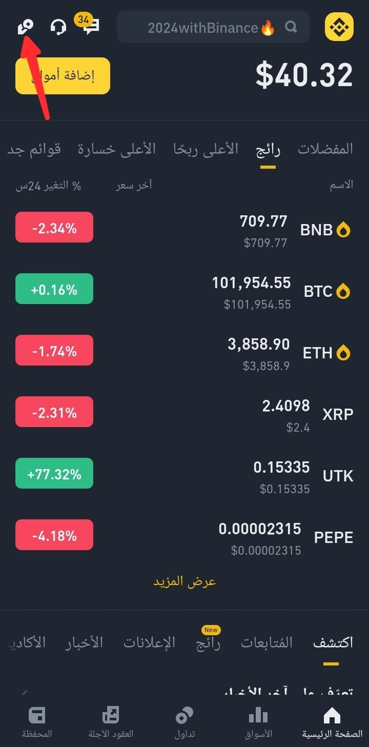 تطبيق بينانس: في التطبيق، اضغط على أيقونة بينانس باي الموجودة في الزاوية العلوية اليمنى من الصفحة الرئيسية.