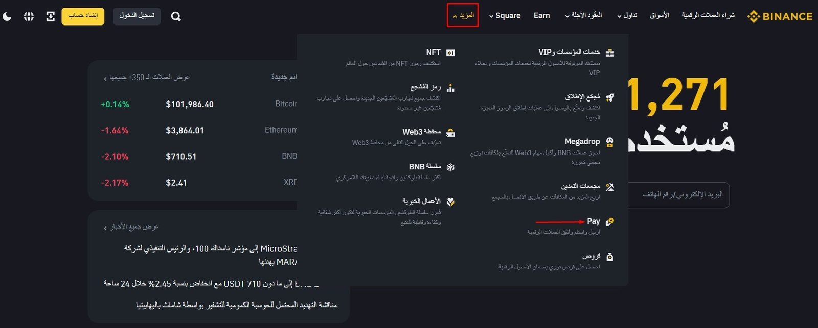 بعد إكمال عملية التحقق من الهوية (KYC)، يمكنك الوصول إلى Binance Pay عبر تطبيق Binance أو موقع الويب.