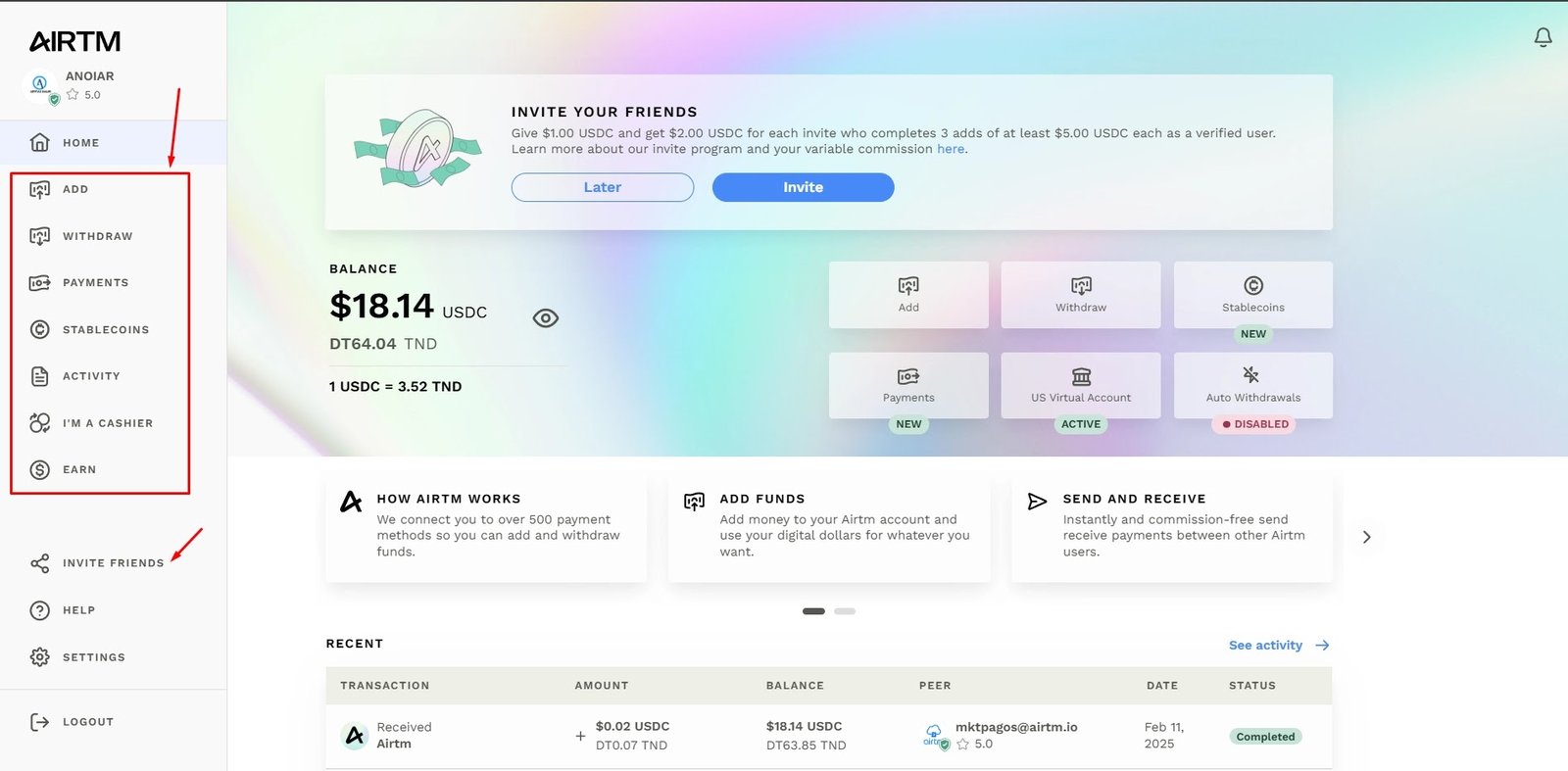 - حساب بنكي أمريكي مجانا: يتوفر حساب بنكي Airtm الافتراضي في معظم الدول التي تقدم Airtm خدماتها فيها، مما يمنح المستخدمين إمكانية الوصول إلى حساب بنكي أمريكي لتسهيل معاملاتهم الدولية.