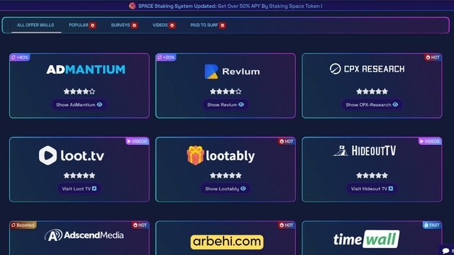 يعمل موقع Final Autofaucet مع العديد من شركات الاستطلاعات والعروض مثل AdMantium وRevlum وCPX-Research، والتي ستسمح لك بكسب رموز Dutchy بكل سهولة. وتوفر هذه الشركات فرص رائعة لكسب الكثير من العملات الرقمية من خلال لعب الألعاب والإجابة على الاستطلاعات وتحميل التطبيقات. وللوصول إلى شركات العروض، آنقر على “Earn DUTCHY” الموجودة في القائمة الرئيسية ثم “OffersWalls”.