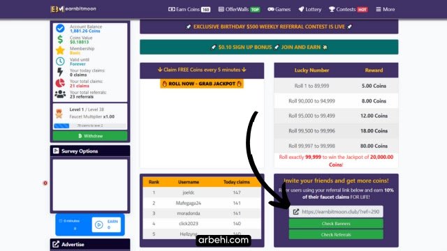 يمكنك كسب ما يصل إلى 10% مما يربحه المستخدم الذي قمت بدعوته إلى التسجيل في موقع Earnbitmoon، طبعًا لن يتم إقتطاع المبلغ من رصيد الإحالة بل ستحصل عليه بشكل مجاني وهو عبارة عن هدية يقدمها الموقع لزيادة عدد الأعضاء. وللوصول إلى رابط الإحالة الخاص بك كل ما عليك سوي التوجه إلى الصفحة الرئيسية للموقع.