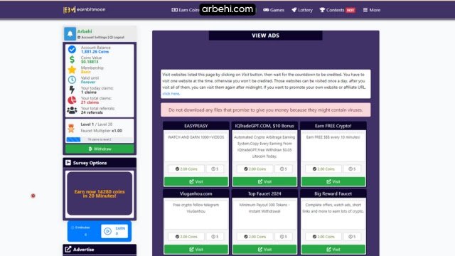 كما هو الحال مع معظم المواقع المختصة بجمع العملات الرقمية مجانًا، يمكنك الربح من الضغط على الإعلانات أو الدفع مقابل النقر (PTC). من السهل زيارة المواقع وغالبًا ما تستغرق ما بين 5 إلى 10 ثوانٍ لكل مشاهدة للإعلان، وستحصل مقابل ذلك على 2 كوينز.