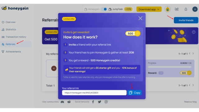 يمكنك كذلك زيادة أرباحك من خلال دعوة مستخدمين جدد للانضمام إلى موقع honeygain. عندما تقوم بدعوة أشخاص ويقومون بالتسجيل وتثبيت البرنامج، سوف تكسب 10% من أرباحهم اليومية. ولن يتم أخذ عمولتك من أرباحهم ولكن سيتم دفعها بواسطة Honeygain.