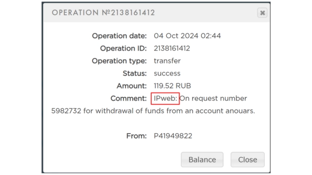 لقد قمت بالسحب أكثر من مرة من موقع IPweb عن طريق محفظة Payeer. وهذا آخر إثبات سحب بقيمة 119.52 روبل.