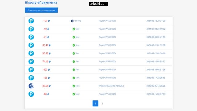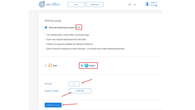 الحد الأدني للسحب من الموقع هو 15 روبل، ويتم الدفع في غضون يومين عمل من تاريخ تقديم آخر طلب للسحب. لقد سحبت من الموقع 1108 روبل وهو ما يعادل 12.40 دولار.