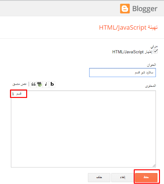 لإضافة سلايدر شو، قم بالدخول إلى التنسيق ثم إضغط على تعديل أمام قسم سلايد شو، تقوم بكتابة إسم القسم أو التسمية التي تريدها أن تظهر في سلايدر شو ثم تضغط علي حفظ.