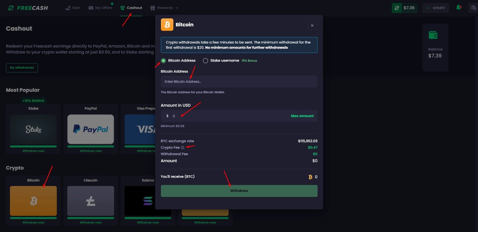 بالإضافة إلى ذلك، يجب إدخال المبلغ المراد سحبه بالدولار الأمريكي. يجدر التذكير أن موقع Freecash يعتمد على نظام نقاط داخلي حيث يعادل 1 دولار = 1000 عملة Freecash. على سبيل المثال، إذا كنت ترغب في سحب 10 دولارات بالبيتكوين، يجب أن يكون لديك 10,000 عملة Freecash في رصيدك.