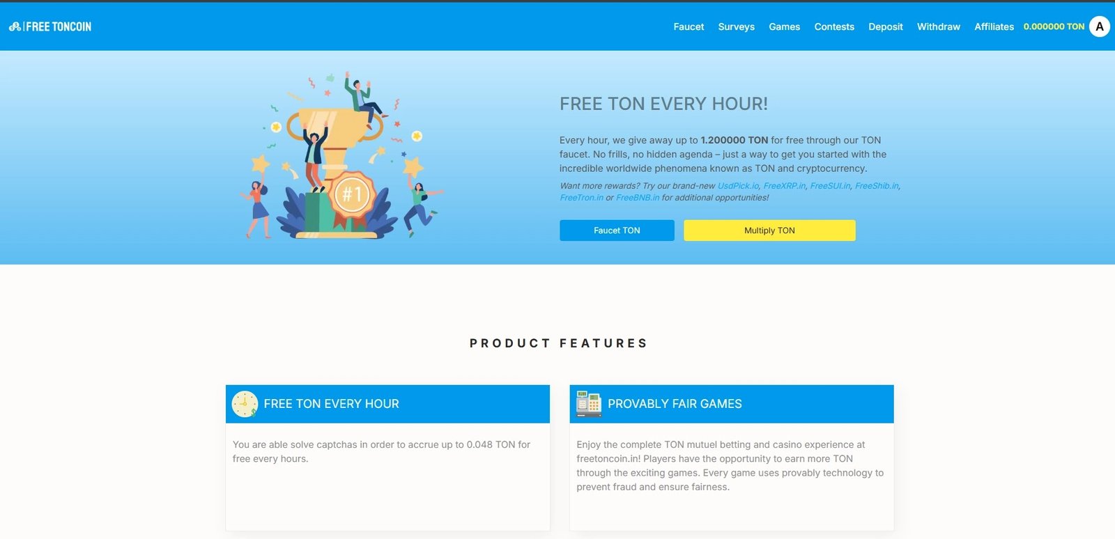 ويتيح صنبور freetoncoin للمستخدمين امكانية جمع عملة TON كل ساعة ، وتزداد قيمة المكافأة تدريجيًا كلما استمر المستخدم في استخدام الصنبور. كما يتميز صنبور جمع التون بواجهة مستخدم بسيطة وسهلة الاستخدام، كما يوفر مكافآت إضافية للمستخدمين النشطين.