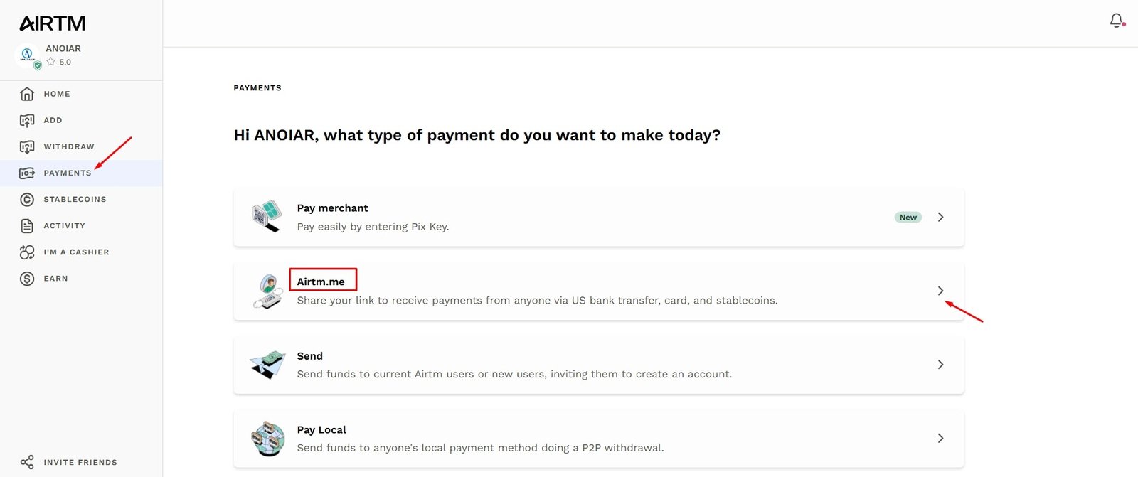 العملية أبسط مما تتوقع. بمجرد تسجيل الدخول إلى حسابك على Airtm، ما عليك سوى التوجه إلى قسم “Payments” أو “المدفوعات”، ثم اختيار خيار “Airtm.me”. خلال ثوانٍ، ستتمكن من إنشاء رابط الدفع الخاص بك، والذي يمكنك نسخه ومشاركته مع أي شخص حول العالم.