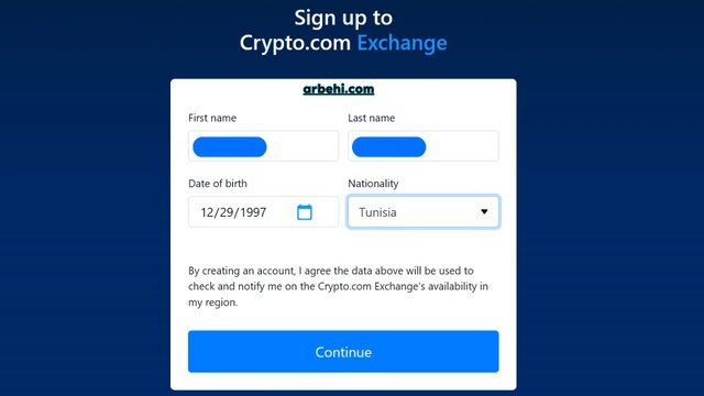بعد ذلك انقر على “Continue”، سيطلب منك مرة أخرى إضافة المعلومات الأساسية، كما هو موجود في الوثائق الرسمية، وللامتثال للمتطلبات التنظيمية، تتطلب كريبتو دوت كوم من جميع المستخدمين إكمال عملية KYC.