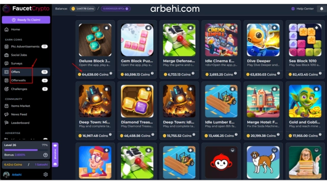 تتوفر الكثير من المهام والعروض البسيطة في قسم Offers وقسم Offerwalls، المهام عادة ما تكون الإجابة على الاستبيانات أو الاختبارات، و مشاهدة مقاطع الفيديو، و تنزيل تطبيقات أو ألعاب الهاتف المحمول وتشغيلها، و التسجيل في مواقع الويب.