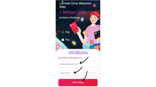 - أدخل البريد الإلكتروني أو رقم الهاتف، ثم آنقر على “GET 5$”.